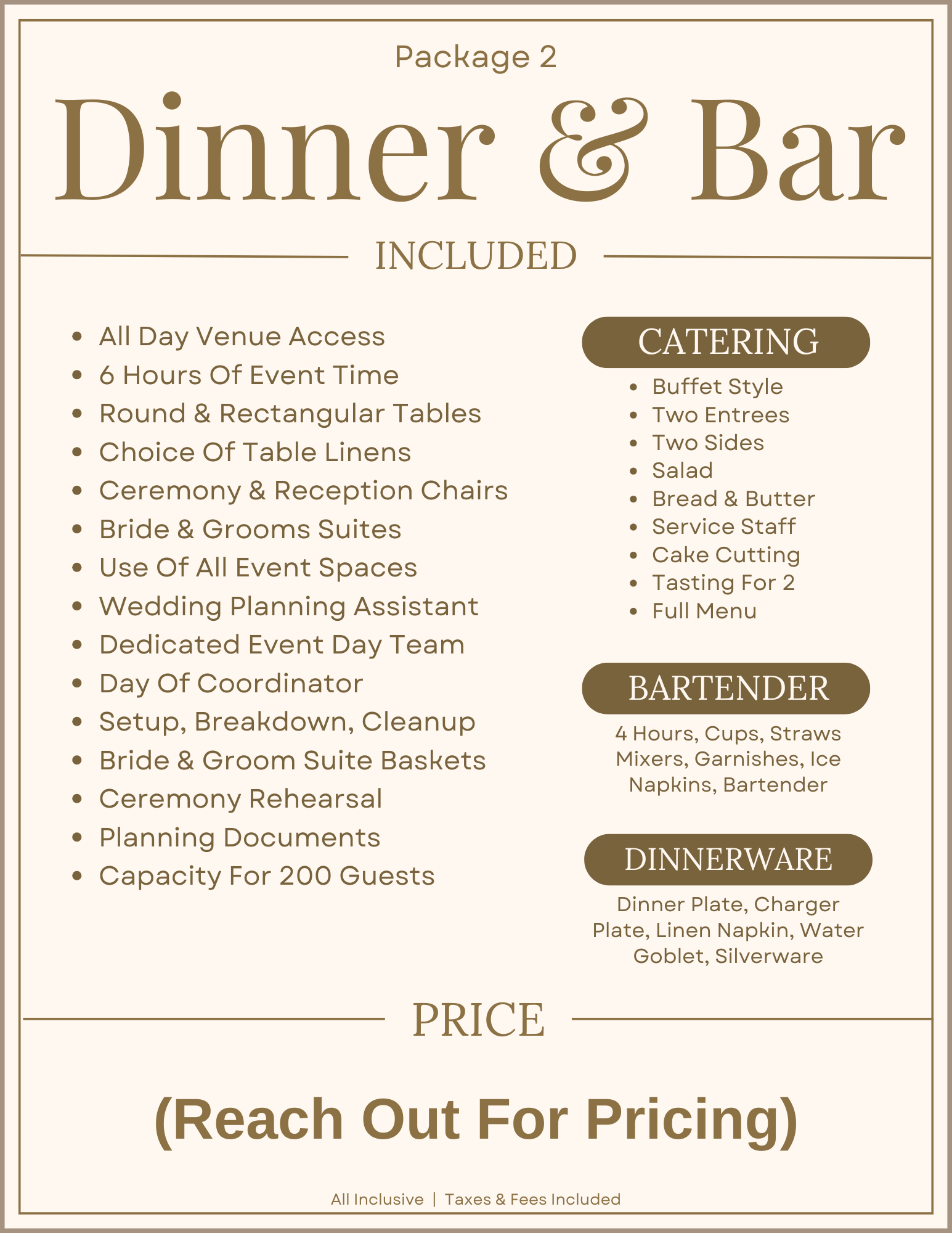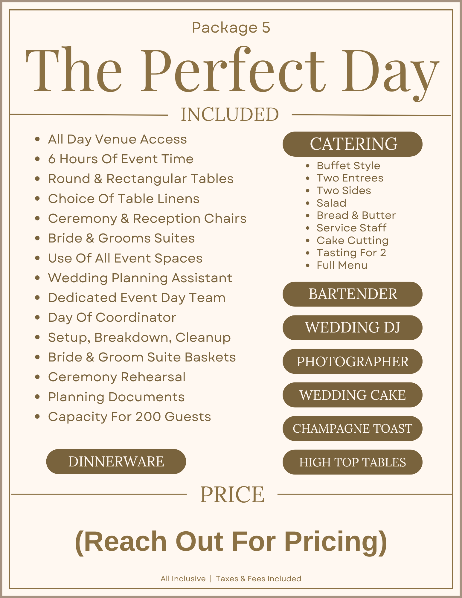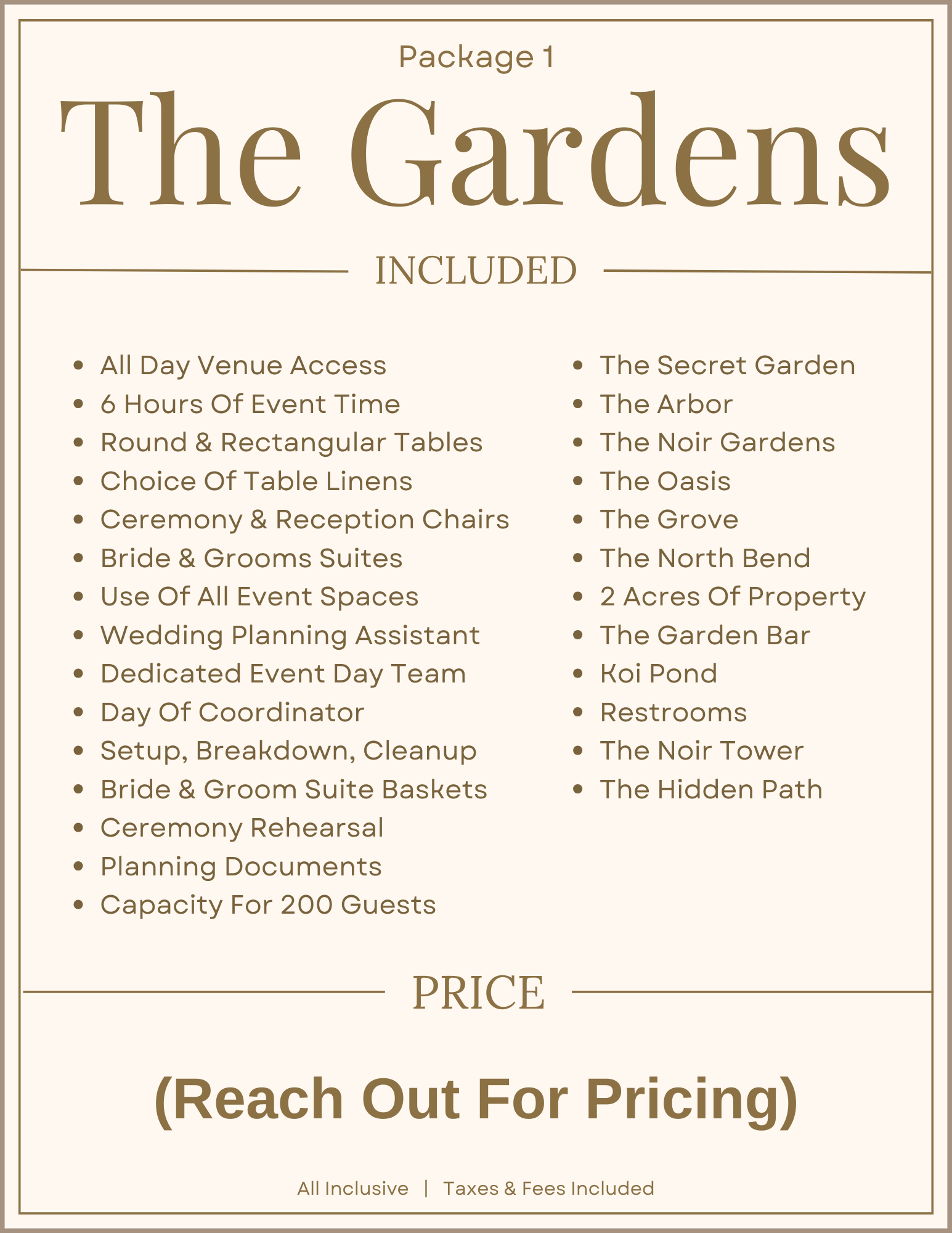 Whether you’re looking for a Turn Key Package that includes Vendors and Services, or you want something simpler so you can bring in your own team, we’ve got you covered. We designed six amazing options to choose from, each including full use of the property, planning assistance, a dedicated event team, setup, breakdown, cleanup, tables, chairs, linens, and much more. Scroll down to learn more and see our packages, or reach out to get a copy of our Price Guide.